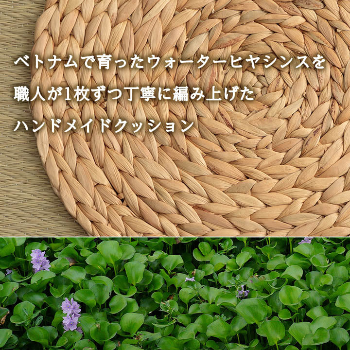 ■ベトナムで育ったウォーターヒヤシンスを職人が1枚1枚丁寧に編み上げたハンドメイドクッションです。 ■べたつく夏でもさらっとした肌触りで、快適にお過ごしいただけます。 ■置くだけで雰囲気が出るので、リビングや飲食店にも最適です。 ※天然素材のため、小さな傷や色ムラが生じます。また、素材の端が飛び出しているため、ストッキングなどほつれやすい衣類との接触にご注意ください。爪切りなどで丁寧に切ってご対応ください。 ※手作りのため、色合いやサイズに個体差がございます。 ※上記の理由による返品・交換は承りかねます。ご了承の上、お買い求めください。 |
