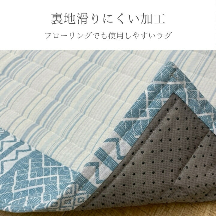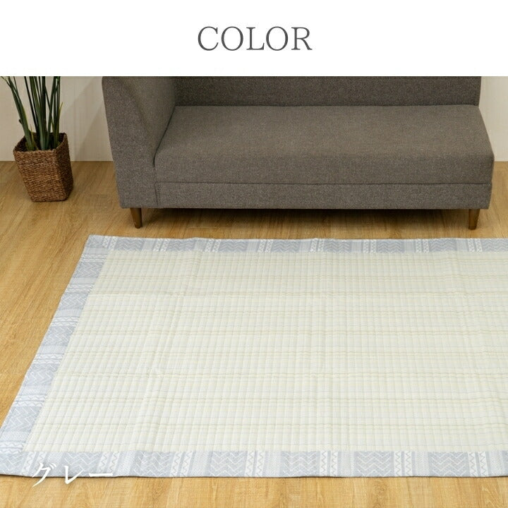 表地綿100%。中心部分のしじらはシャキッとさわやか。さらっとしていて夏に最適。凹凸感があり肌ざわり◎。額部分は北欧テーストを採用し明るい雰囲気を出した商品です。柄に垂直にキルトを入れるこだわりの製法を採用して見た目にもすっきりとした商品に仕上げています。裏素材は強度のあるポリエステル不織布を採用。すべりにくい加工をしているのでフローリングでも使用しやすい商品です。約1.5畳サイズでソファー前やベッド横などに最適。敷きパッドとしても使用できるサイズです。 |
