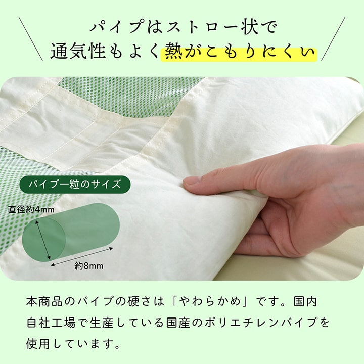 ■ヒバエッセンス練り込みパイプを使用しています。 ■ヒバの木から抽出した「ヒバエッセンス」をメーカー独自の技術でパイプに加工しました。 ■ヒバエッセンスにはヒノキチオールという、天然物質では極めて抗菌性の高い成分が含まれています。(無加工品に比べ、抗菌防臭効果があります。) ■ヒバエッセンスで安らかな森の眠りをご提案します。 ■パイプ使用のため、通気性がよく、熱がこもらず心地よくご使用できます。 ■ファスナー式で中材(パイプ)の交換、高さ(量)の調節が可能です。 ■ご家庭で簡単にパイプが洗えます。 |