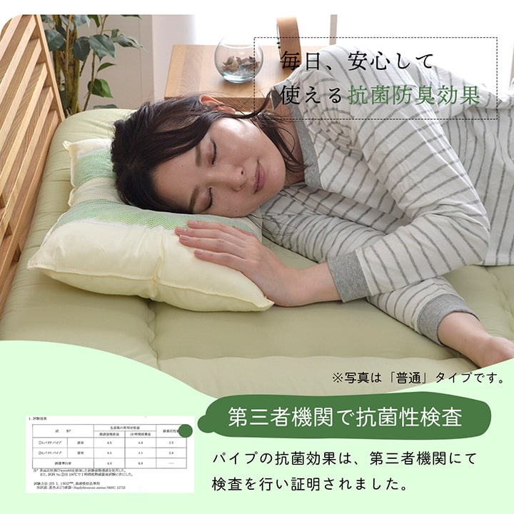 ■選べる高さが3種類。 ■ご希望のサイズを選んで下さい。 ■ヒバエッセンス練り込みパイプを使用しています。 ■ヒバの木から抽出した「ヒバエッセンス」をメーカー独自の技術でパイプに加工しました。 ■ヒバエッセンスにはヒノキチオールという、天然物質としては極めて抗菌性の高い成分が含まれています。(無加工品に比べ、抗菌防臭効果があります。) ■ヒバエッセンスで安らかな森の眠りをご提案します。 ■パイプ使用のため、通気性がよく、熱がこもらず心地よくご使用できます。 ■リバーシブルタイプでひばパイプ側、ポリエステルわた側の2種類の触感を楽しめます。 |
