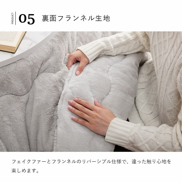 ■大人かわいいシンプルデザインのラピアスシリーズです。ふわふわな極上のタッチ感で暮らしに幸せをお届けします。 ■表地にはフィラメント糸でふわふわなフェイクファーを使用しています。毛羽立ちが少なく、耐久性にも優れています。 ■フェイクファーは毛が抜けにくいマイヤー織りで、毛足の長さは長すぎず使用感がほどよい約10mmを採用しました。 ■裏地には柔らかく、肌触りの良いフランネル生地を使用しています。両面使用可能なリバーシブルタイプです。 ■中わたに抗菌防臭加工を施しました。 ※こたつ台、ラグは別売りです。 ※本商品は、同シリーズでも色味が異なる場合がございます。あらかじめご了承ください。 ※フェイクファーは、毛足の向きによって色の見え方が変わるのが特長です。 ※生産時期により同色でも若干色味が異なる場合がございます。 ※使い始めは遊び毛が出る可能性がございますので、ご使用前に掃除機でやさしく吸い取ってください。 ※滑らかな肌触りが特徴の製品です。ご使用中の転倒にご注意ください。 ※掲載写真は表記サイズと異なる場合がございます。 ※画面上のカラーはご使用ブラウザやモニターの設定により、実物とは若干異なる場合がございます。あらかじめご了承の上、ご注文をお願いいたします。 ※ふとんをやぐらの中に押し込んだり、座イスやイス全体をこたつの中に入れたまま使用しないでください。ふとんがヒーターに当たらないようにご使用ください。(火災の原因になります)ご使用により、ふとんが焦げた場合につきましては、返品・交換を承ることができませんので、あらかじめご了承ください。 |