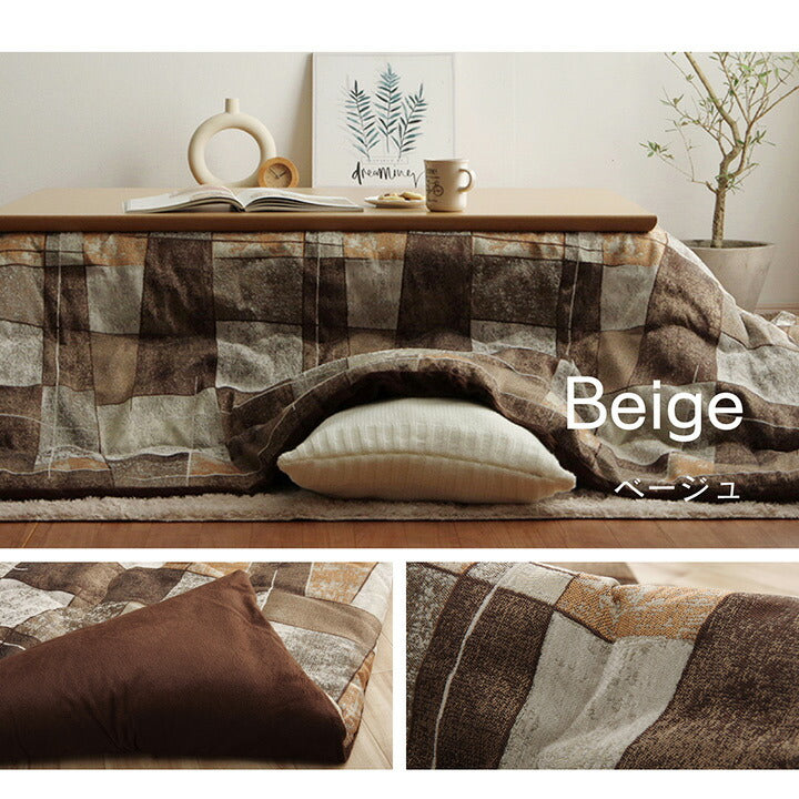 ビンテージ風のパッチワークデザインが特徴のしっかりした生地を使ったこたつ布団。表地はシェニール織りの暖かみある凹凸感ある生地を使用し、裏地にはなめらかな肌触りの短毛マイクロ生地を使用しています。たっぷり入った東レマッシュロン綿がふかふかとした弾力性と保温性を高め、「軽くて暖かい」を実現しました。ふっくらとしたボリューム感は国内で綿入加工をしている商品だからできる仕上がり。1枚1枚丁寧に仕上げた安心の品質です。 |