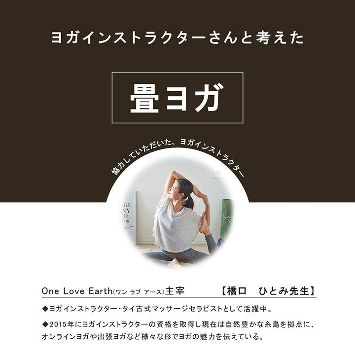 ヨガインストラクターさんもおすすめする畳ヨガマット。い草の香りでリラックス効果も抜群。 国産のい草を使用しているため、一本一本が太く、表皮が厚く繊維がキメ細かいので弾力性があり、耐久性に優れています。 裏材にはTPE(熱可塑性エラストマー)を使用しているため、焼却時に有害物質を発生しにくく地球環境にやさしい素材でもあります。また裏材にPVC素材を使用しているものよりも軽くて持ち運びしやすくなりました。 い草には消臭効果や湿度調節効果もあるため、汗のにおいも気にならずさらっとした肌触りでべたつき感もありません。また嬉しい抗菌防臭効果もあります。 通常のヨガマットより幅と長さが少し大きめに作られているので、全身をのびのびと動かしやすく身長が高い方でも使いやすいサイズになっています。 |