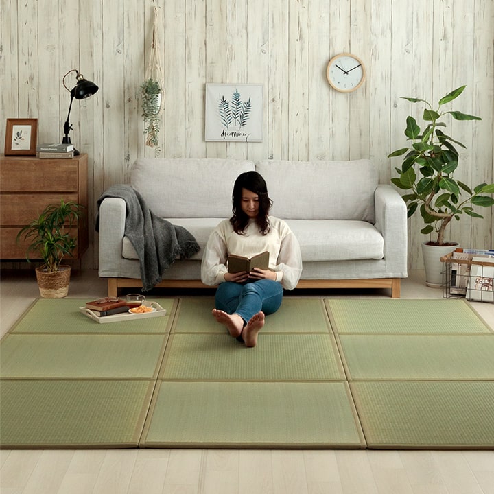 ■ダニ増殖抑制99%を実現する特殊な滅ダニシートを使用した、新発想のダニがいなくなる置き畳です。 ■フローリングに置くだけ。なつかしい畳の香りと肌ざわりを手軽に楽しめます。 ■い草は九州産のみを使用。日本の風土で育った安心の草です。 ■一本一本が太く、表皮が厚く繊維がキメ細かいので弾力性があり、耐久性に優れています。 ■ヒバの木から抽出した「ヒバエッセンス」をメーカー独自の技術で生地表面に加工しました。 ■ヒバエッセンスにはヒノキチオールという天然物質が含まれており、抗菌防臭効果があります。 ■連結ジョイントは畳1枚につき2個付属します。 |