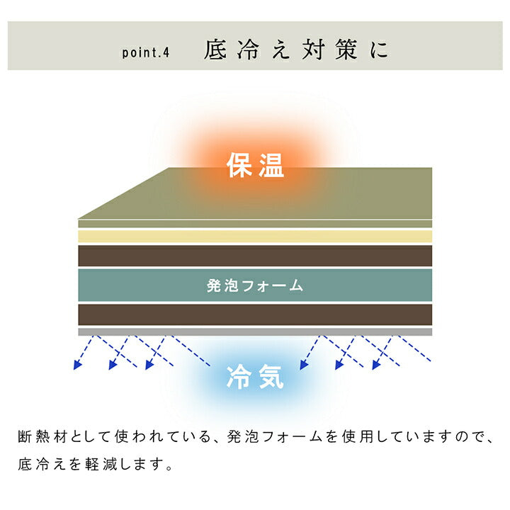表地=い草+ポリプロピレン 中材=ウレタンチップ5mm・木製ボード10mm・発泡ボード15mm・木製ボード10mm 裏地=不織布 |