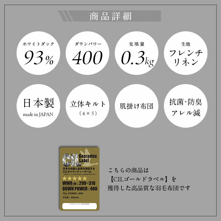 羽毛肌掛け WDD93% DP400 シングル 日本製【メーカー直送品】