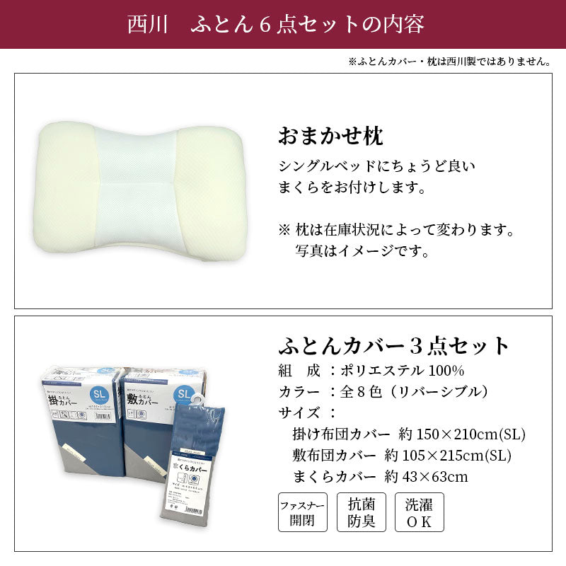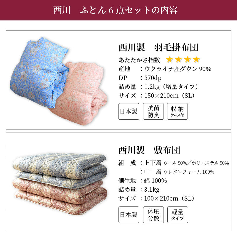 西川羽毛のついた 寝具6点セット 掛け布団 敷布団 枕 カバー 高品質 フランス産ダウン90% 380dp 増量1.2kg セット 羊毛混 布団カバー 無地 リバーシブル 新生活 羽毛掛け 日本製 西川株式会社 布団セット