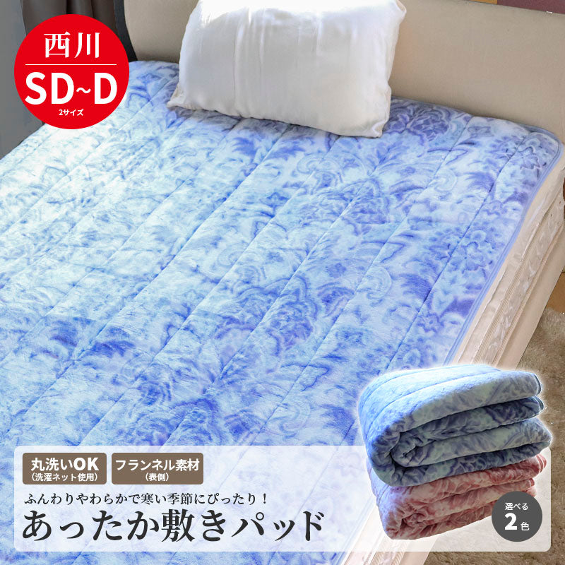 商品キーワード | 敷きパッド あったか 西川 フランネル 敷き毛布 洗える 丸洗いOK ピンク ブルー エレガント柄 選べる2サイズ SD D 120×205cm 140×205cm 秋 冬用 防寒 |