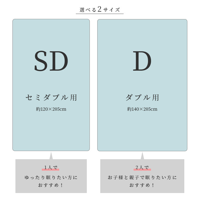サイズ | セミダブルサイズ 約120×205cm ダブルサイズ 約140×205cm (キルティング製 許容範囲+5%〜-3%) |